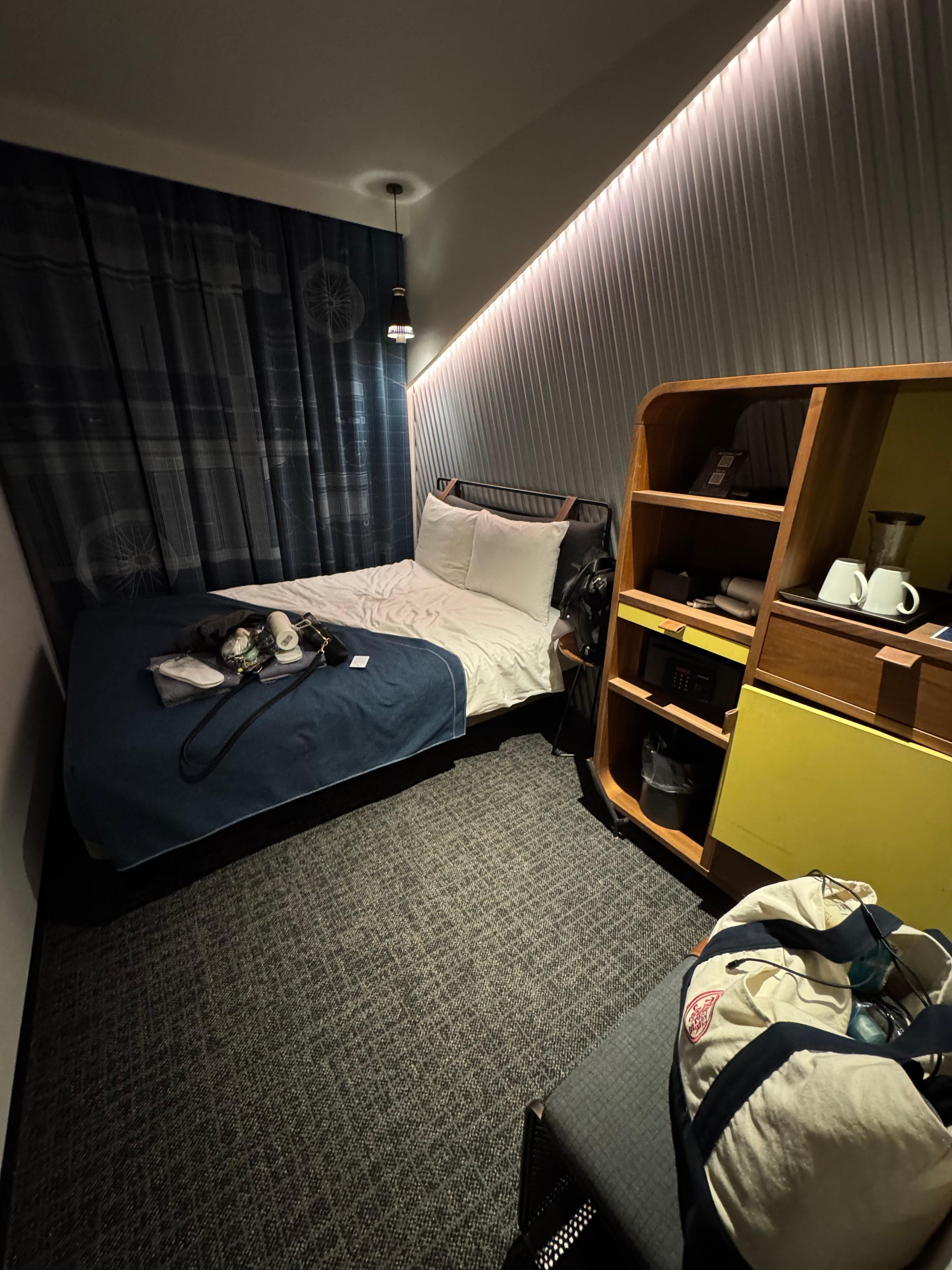 I had a mixed experience during my stay. On the positive side, the bed was comfortable and I did get a good night’s sleep. However, the room was quite small and a bit awkward to move around in, particularly the bathroom door area and especially with luggage coming in and out the room. There were also some cleanliness and condition issues, like peeling paint/wallpaper and a bit of grime around the sink and shower curtain. With the air conditioning you can only manage the flow of air low/medium/high, not the temperature, which isn’t ideal. The common areas and laundrette were not well maintained. The washing machines were grimy, I emptied full bins right next to them and leftover clothing scattered around. The shared spaces didn’t feel clean and tidy, it was all a bit tired and not up to scratch. Overall, it was okay for a short stay, but I think a little maintenance and a refresh would go a long way.