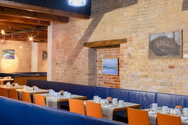 A diverse dining scene awaits with a cafe and bar. Guests can savor buffet breakfasts, in-room champagne service, or couples dining with vegan options.