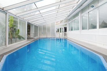 This hotel boasts a luxurious indoor pool, seasonal outdoor pool, and dedicated children's pool. A poolside bar adds to the aquatic delights.
