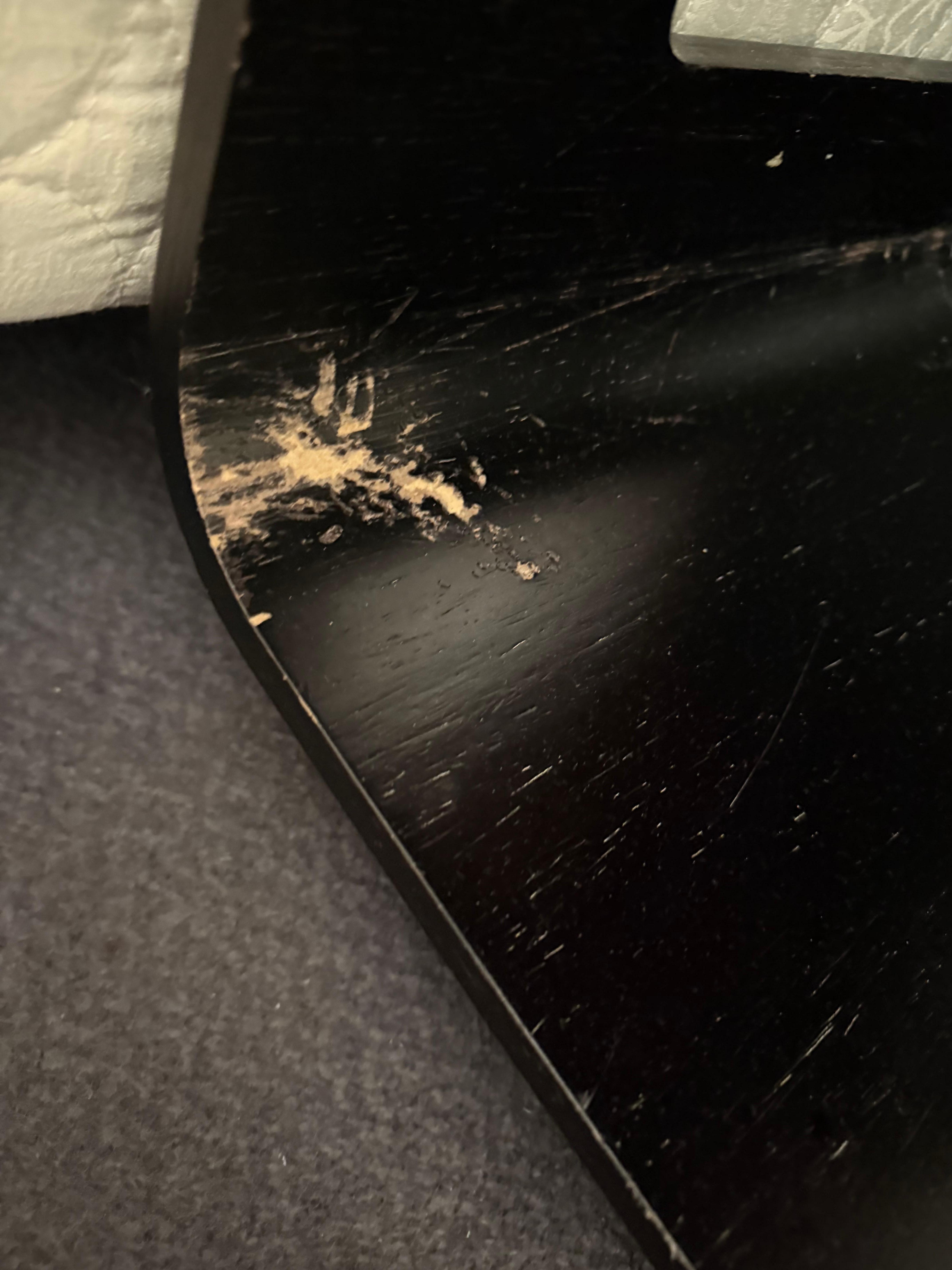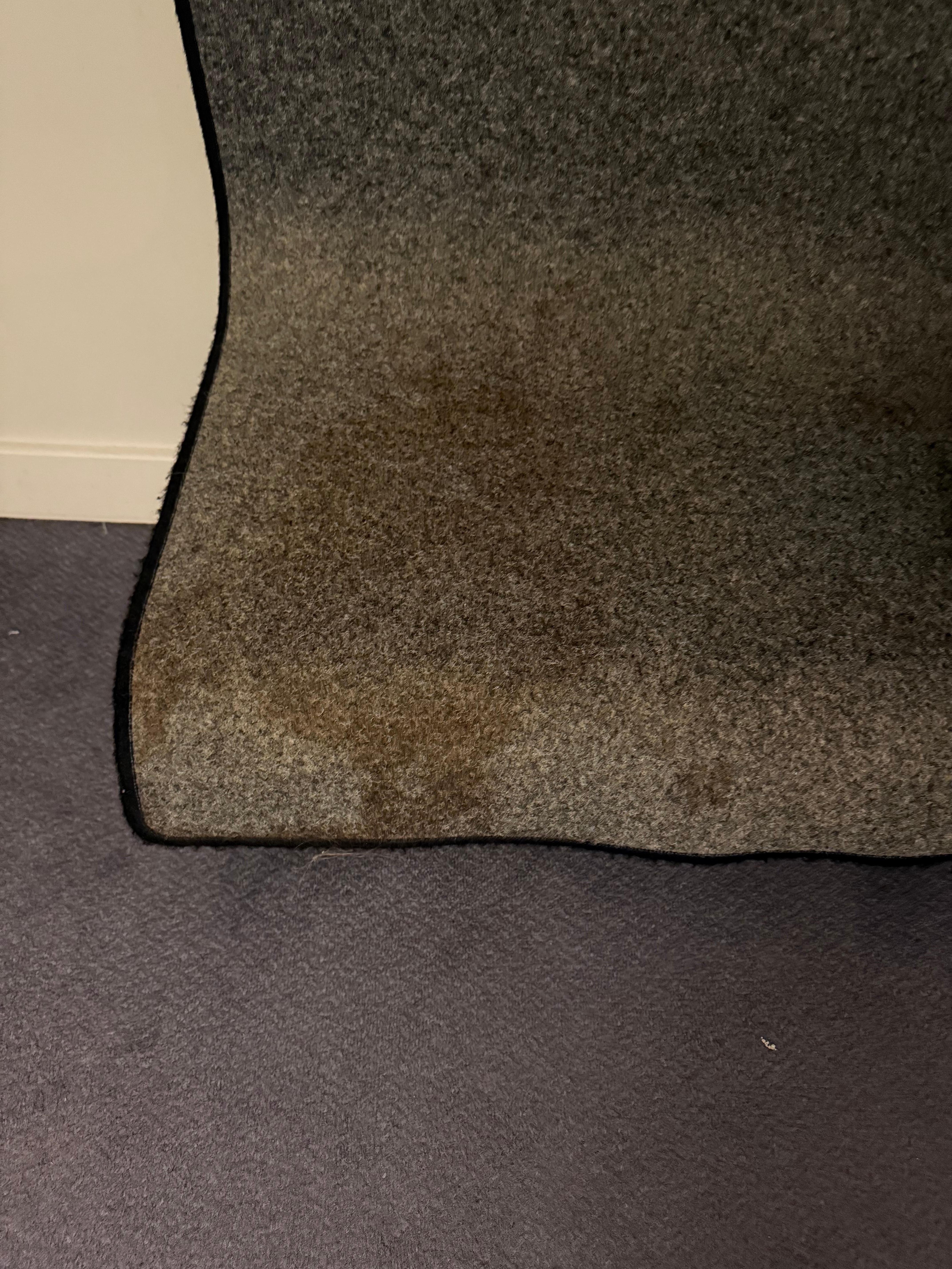 Filthy dirty room. Broken furniture , stains all over the carpet.