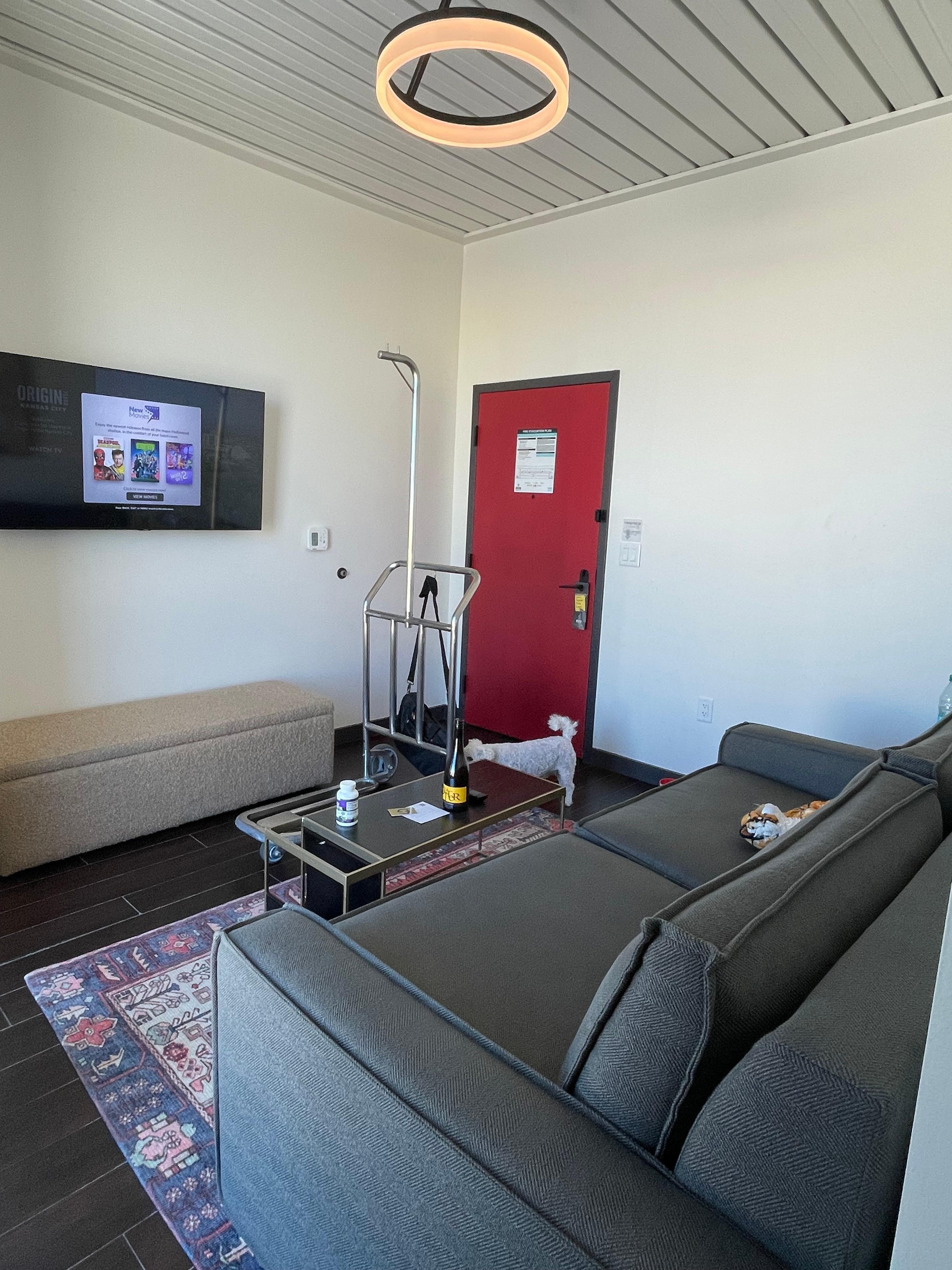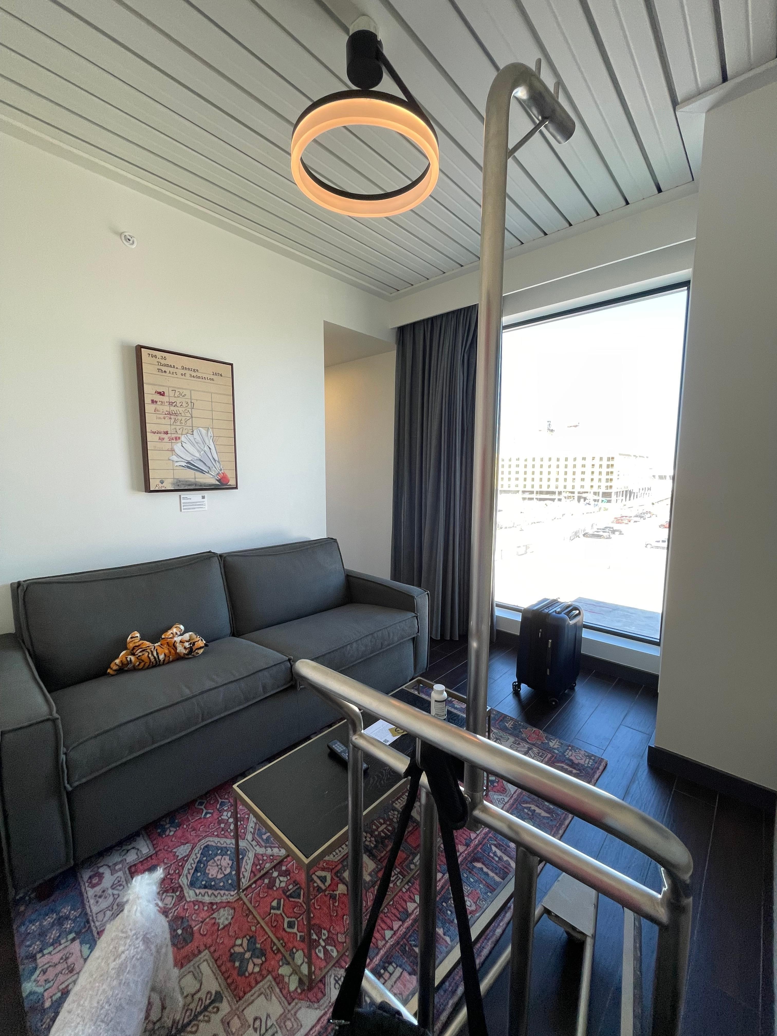 Check-in was awesome. The gentleman at the front desk was great. Dinner in the restaurant was very good. The hotel is new and clean, and in a good location. The room was an issue. It was very small, and the only place to sit comfortably was the bed. There is a bench to sit on, but it's small and pretty uncomfortable. There was no good place to work, other than the bed. Probably wouldn't stay there again.