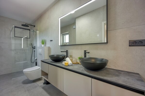 บ้านพักสำหรับครอบครัว, หลายห้องนอน (Villa Aria with heated Pool and) | ห้องน้ำ | ฝักบัว, ไดร์เป่าผม, ผ้าเช็ดตัว, สบู่